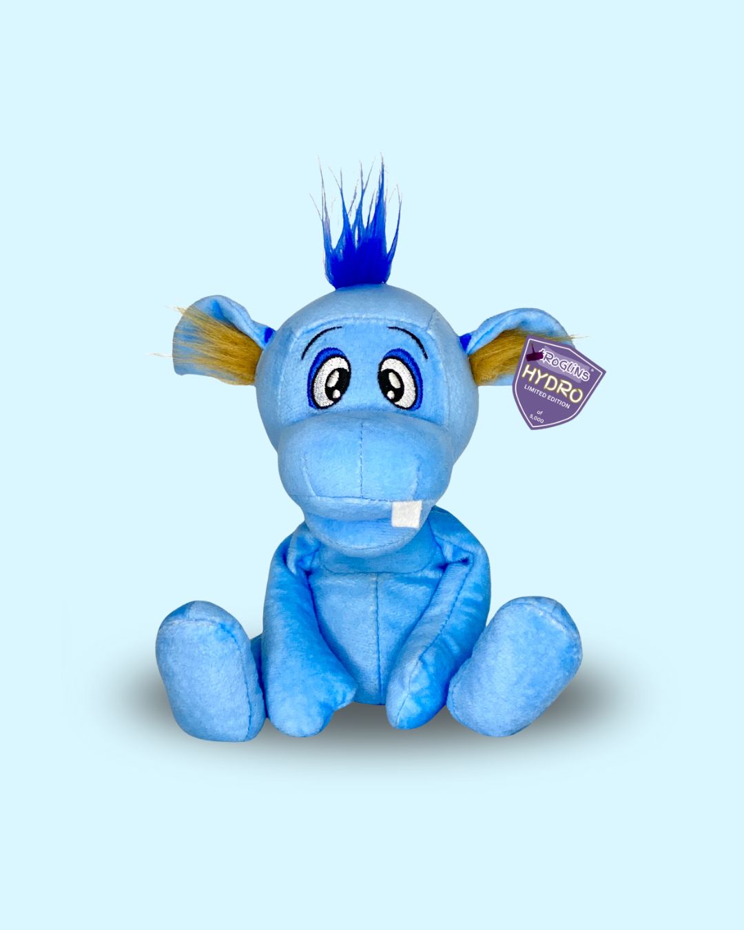 Blue hair on his head that bounces with cheer,