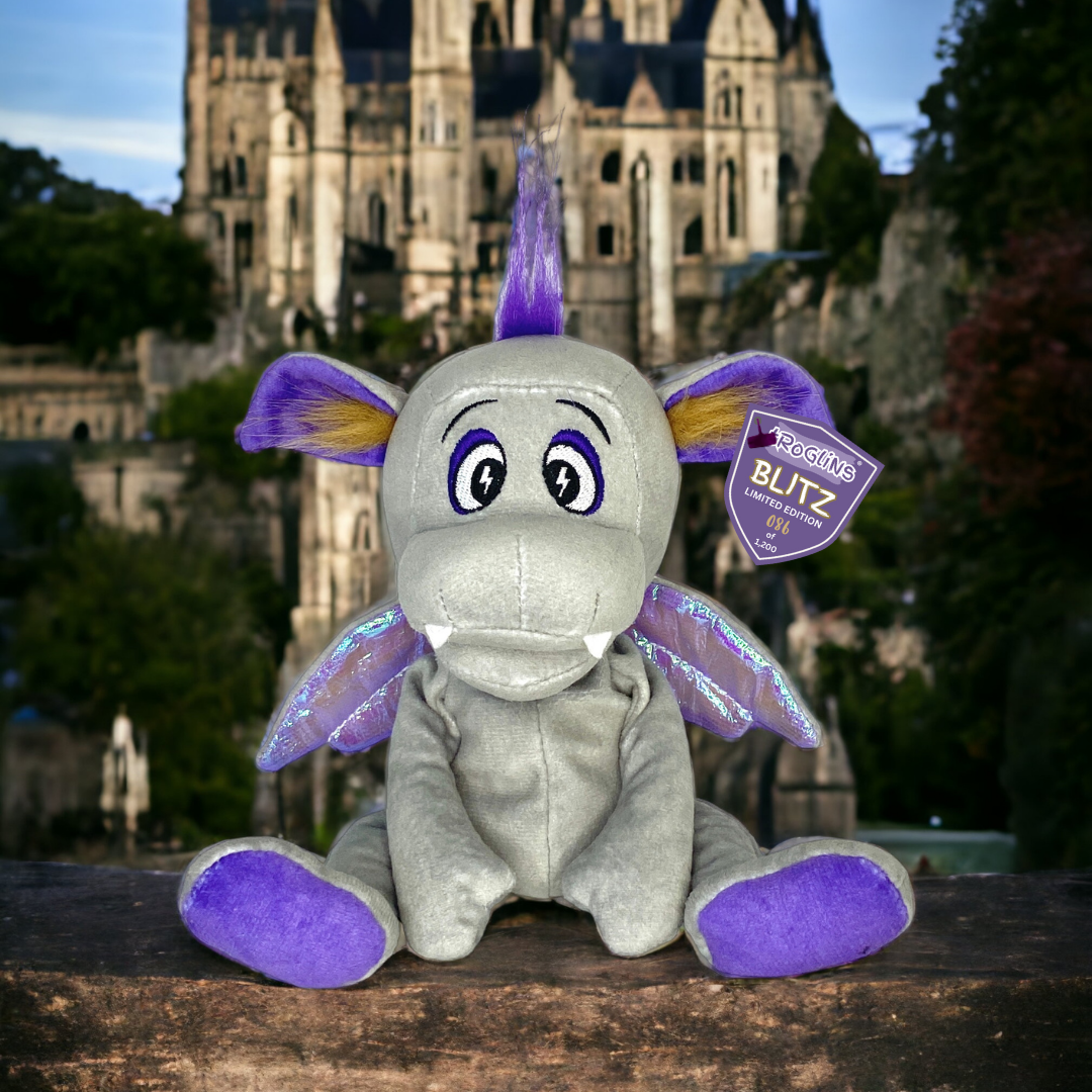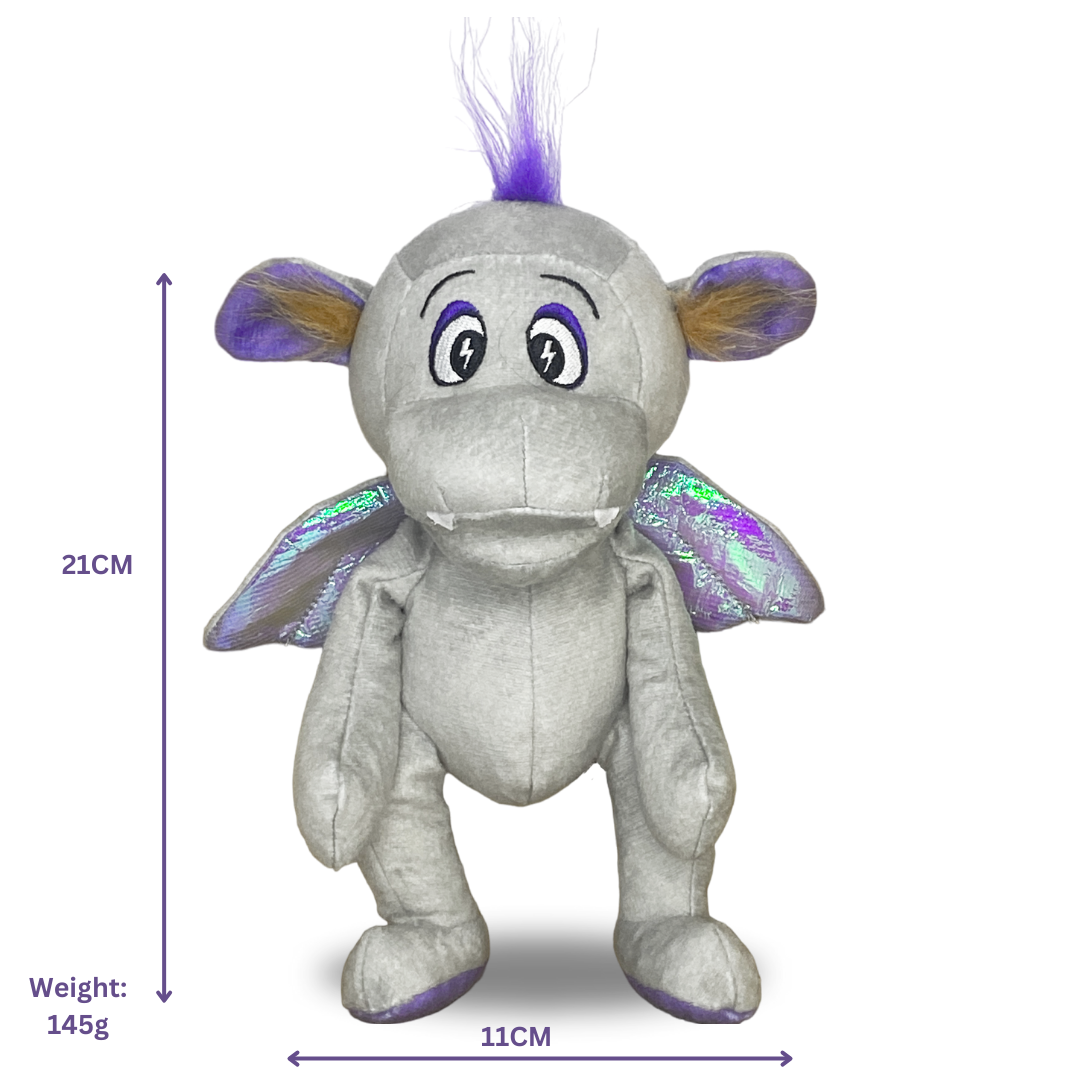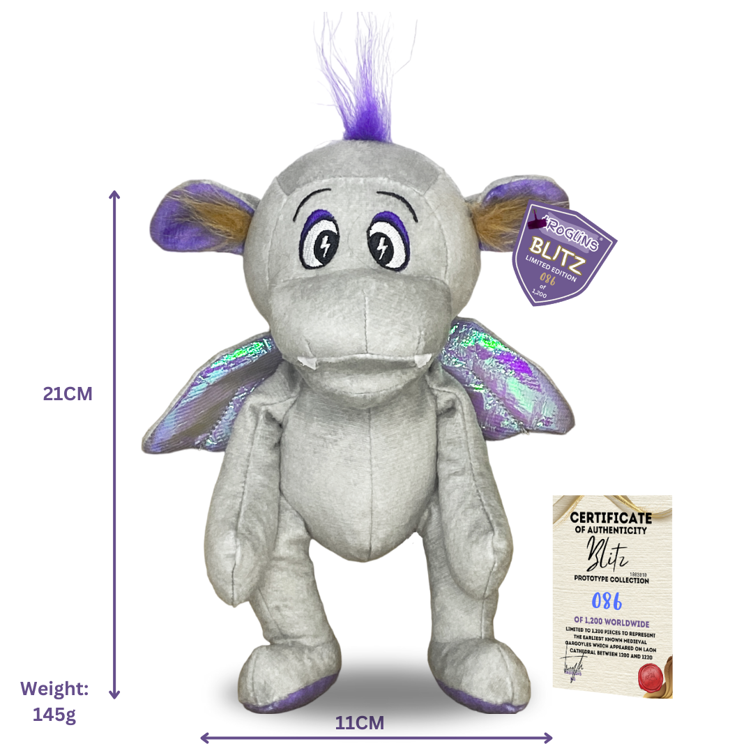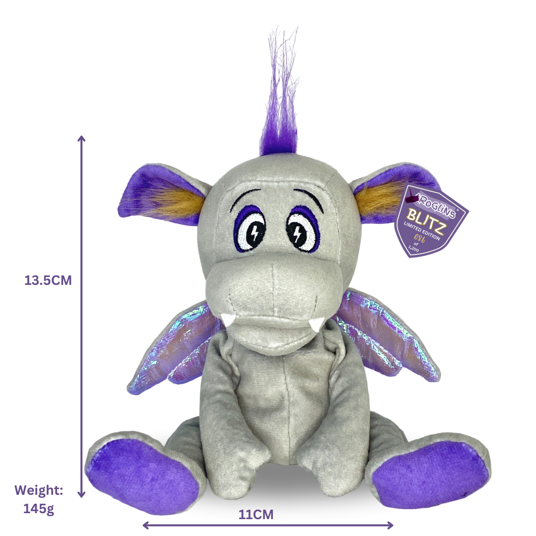 Blitz (Regular) stands at 21cm (13.5cm sitting) and weighs around 145g, which is around 50% heavier than most plush toys the same size.